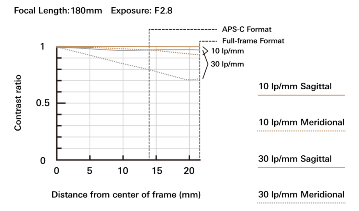 MTF 차트만 봐도 1세대보다 전 구간 해상력이 개선된 것을 알 수 있습니다. 특히 70mm 구간의 화질 향상이 돋보이며, 180mm에서도 최상단에 붙어있는 고해상력을 보여줍니다.